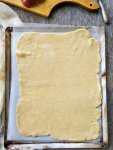 - Ανοίξτε τη ζύμη σε χοντρό δίσκο περ 20 εκ, καλύψτε τη με μεμβράνη και βάλτε τη στο ψυγείο για 30 λεπτά (έως τρεις ημέρες)