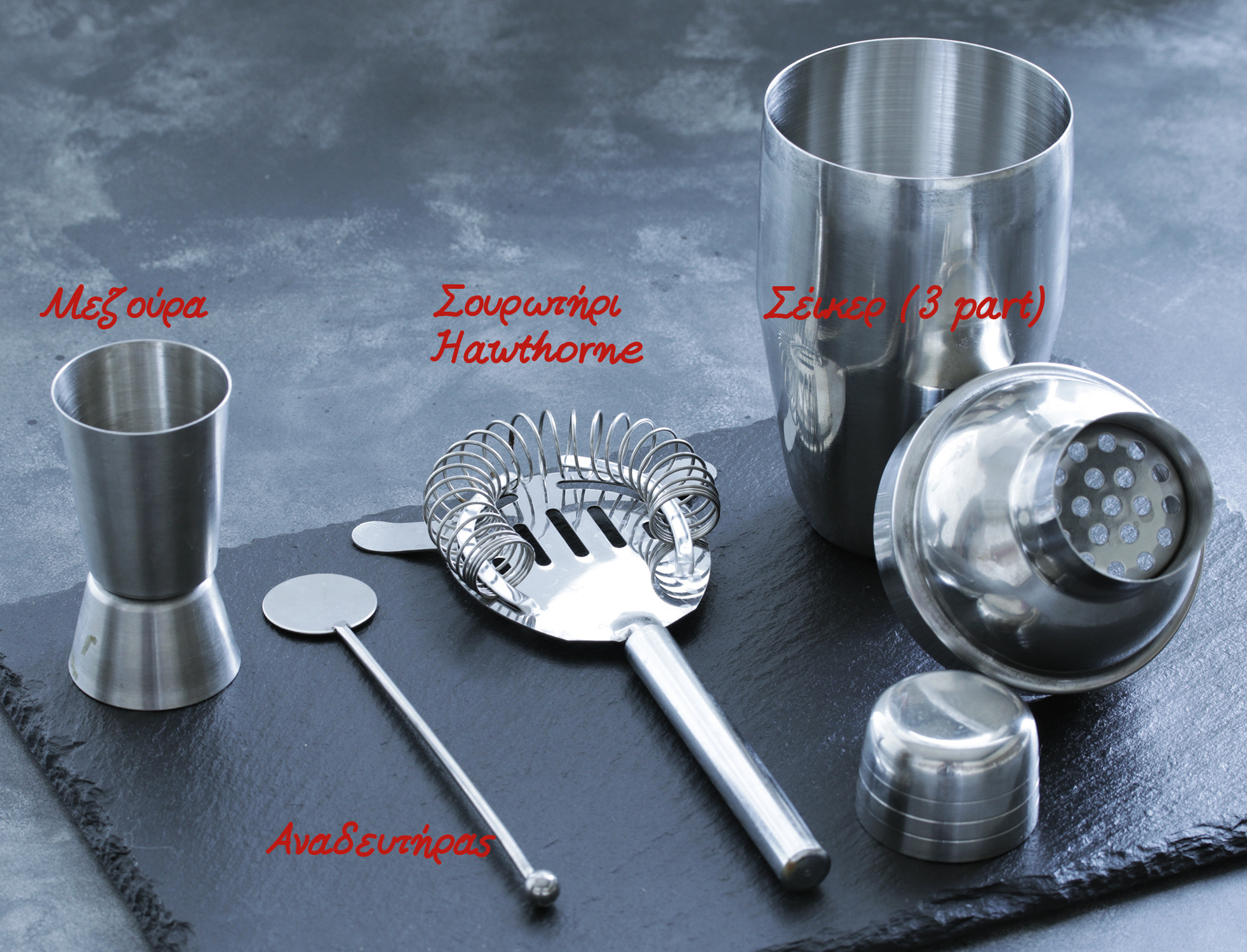 Σουρωτήρι: τα υλικά για ένα κοκτέιλ πρέπει να σουρωθούν στο ποτήρι χωρίς τον πάγο ή τα άλλα υλικά με τα οποία ανακατεύτηκαν. Τα 3 piece σέικερ έχουν ενσωματωμένο σουρωτήρι, αλλά αν έχετε 2 piece, χρησιμοποιήστε ένα λεπτό σουρωτήρι οικιακό μικρό (για το τσάι) ή ειδικό σουρωτήρι μπαρ (hawthorne strainer).