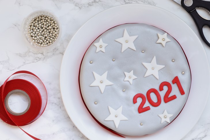 Κολλήστε τα διακοσμητικά και τους αριθμούς με λίγο νεράκι πάνω στην πίτα. Αν θέλετε καλύψτε την πίτα στο πλάι με κορδέλα. Τα ασημένια μπιλάκια είναι αυτά των μνημοσύνων, θα τα βρείτε στα μπαχαράδικα. Καλή επιτυχία!