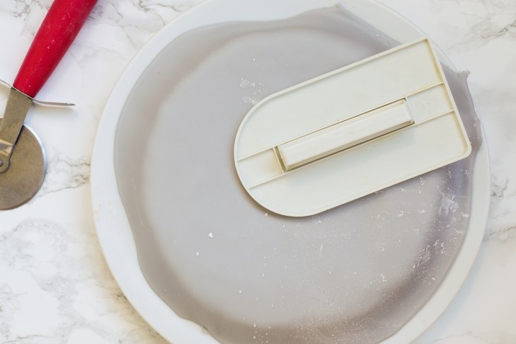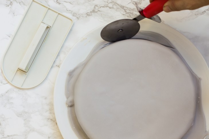 Λειάνετε την επιφάνεια και τα πλάγια καλά με το ισιωτήρι ζαχαρόπαστας. Αν δεν έχετε μπορείτε να κόψετε ένα χοντρό, λείο πλαστικό (από κλασέρ ας πούμε γραφείου) και να χρησιμοποιήσετε αυτό.
