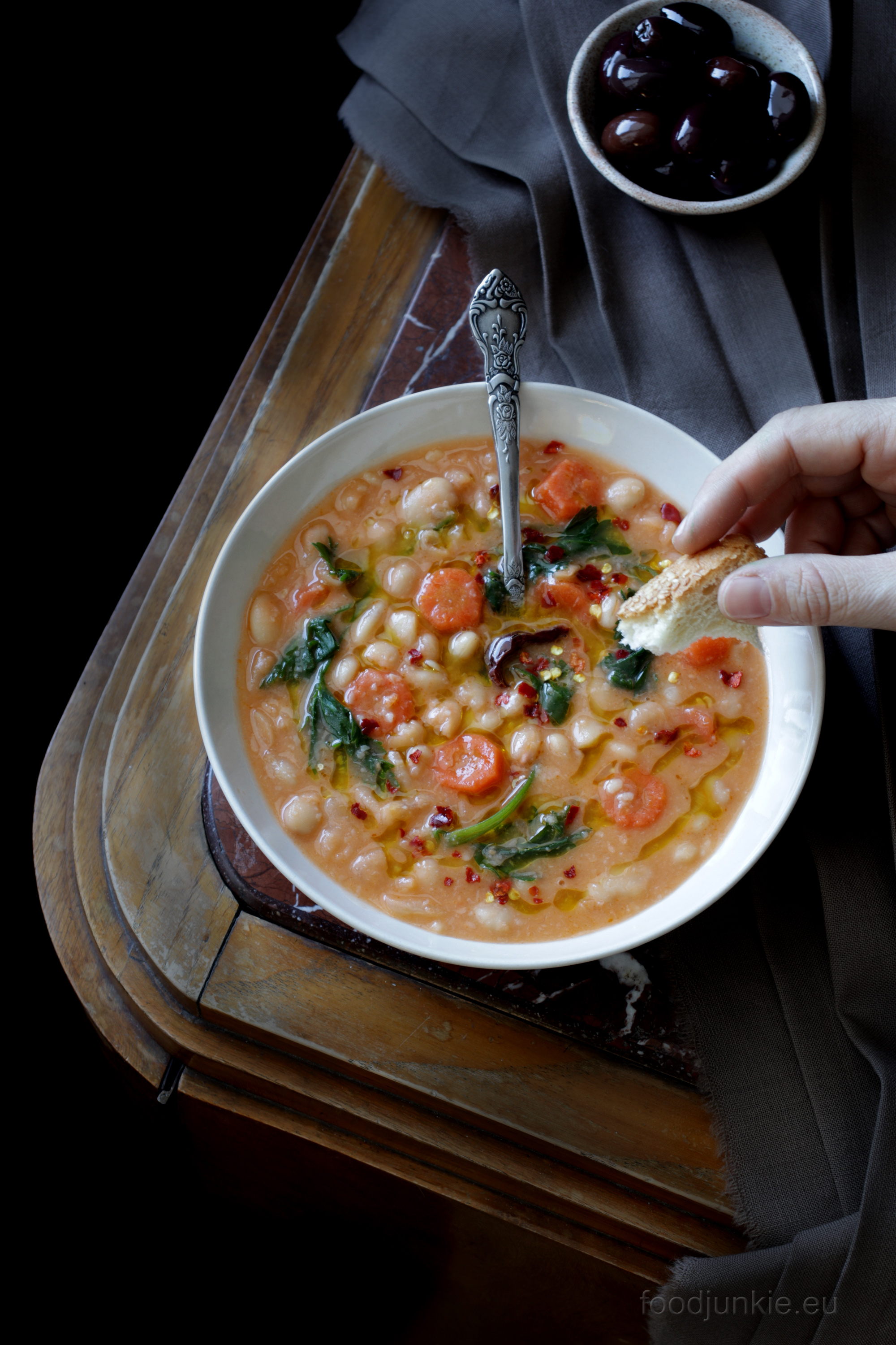 Όλα ξεκίνησαν με τη Δανάη, την κόρη μου, που αν δει κομματάκια μέσα δεν τρώει τίποτα. Γι’ αυτό και άρχισα να βάζω πελτέ, και όχι τριμμένη ντομάτα, ολόκληρο το κρεμμύδι, το σκόρδο και τα σέλινα, ώστε να μπορώ να τα βγάλω όλα, λιγότερο λάδι, για να το βάζω μετά από πάνω. Έτσι, άθελά μου έφτιαξα μια πιο ελαφριά φασολάδα, που δεν στερείται γεύσης και δεν πειράζει τόσο το στομάχι. Ελπίζω να σας αρέσει!