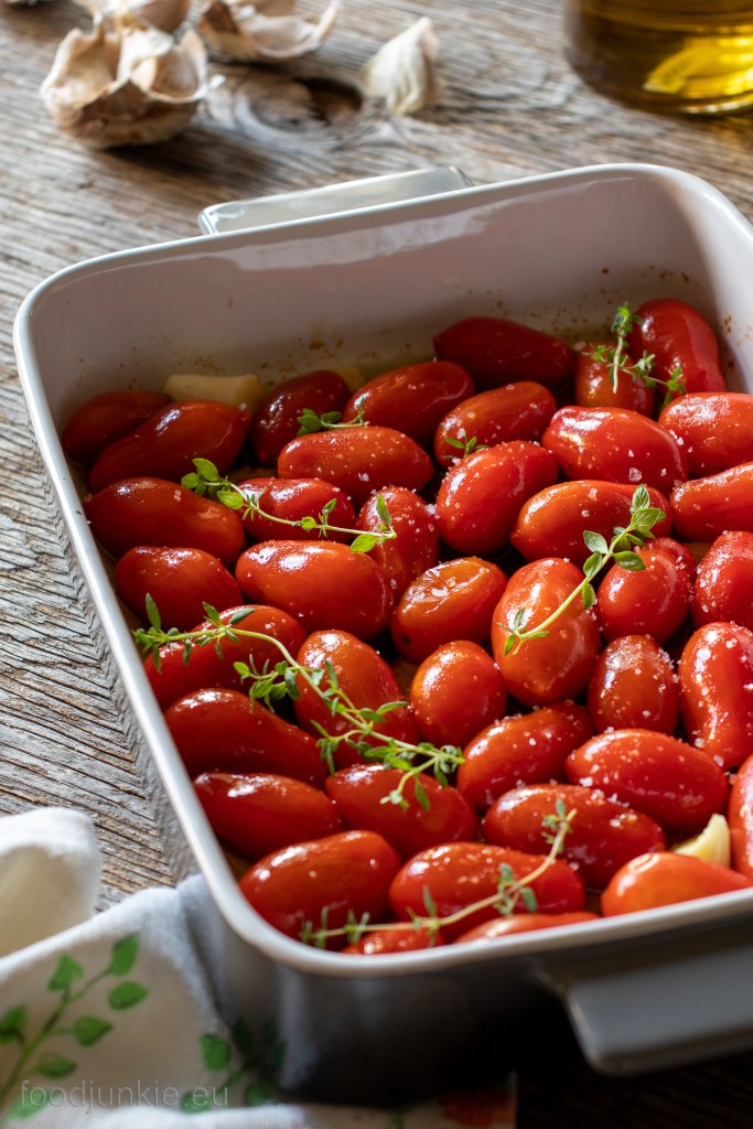 - Πλένουμε καλά τα τοματίνια και τα απλώνουμε μαζί με τις σκελίδες σκόρδου σε ένα ορθογώνιο πυρέξ περ. 20 x 32 εκ.