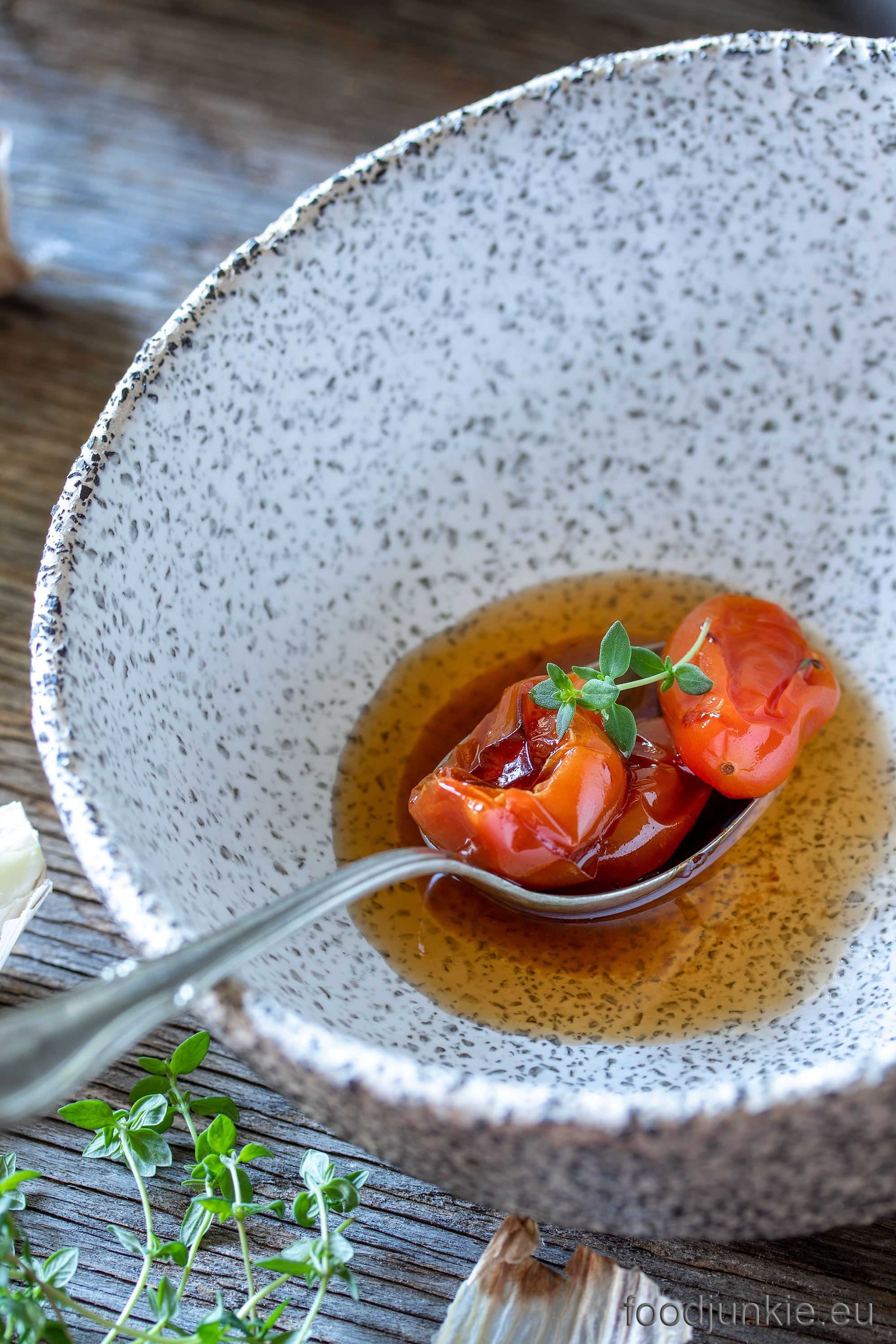 Τα τοματίνια είναι λίγο εθιστικά νομίζω. Δεν υπάρχει περίπτωση να τα πλύνει κανείς και να τα βάλει σε μπολ και να μην τα τσιμπολογάει όλη μέρα! Φυσικά κάνουν υπέροχες σαλάτες (όπως αυτός ο αποδομημένος ντάκος σαν cheesecake), αλλά και τάρτες ή μπουκίτσες με γαύρο μαρινάτο και ρόκα, αλλά αν αγοράσετε πολλά και δεν ξέρετε τί να τα κάνετε, σας έχω μια ωραία ιδέα!