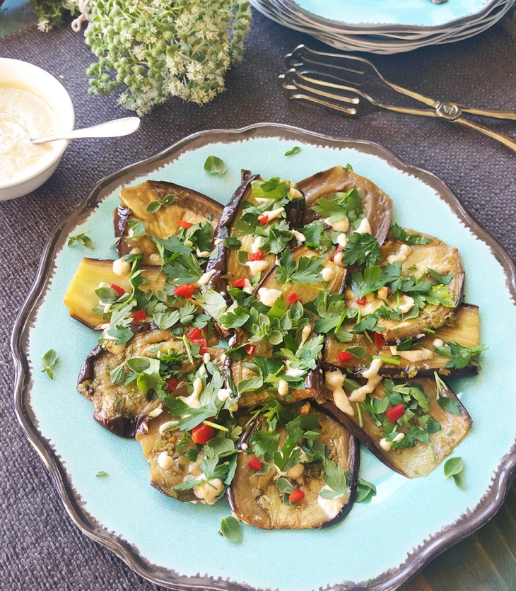 Easy grilled, marinated aubergines (eggplants) with lemon-tahini sauce